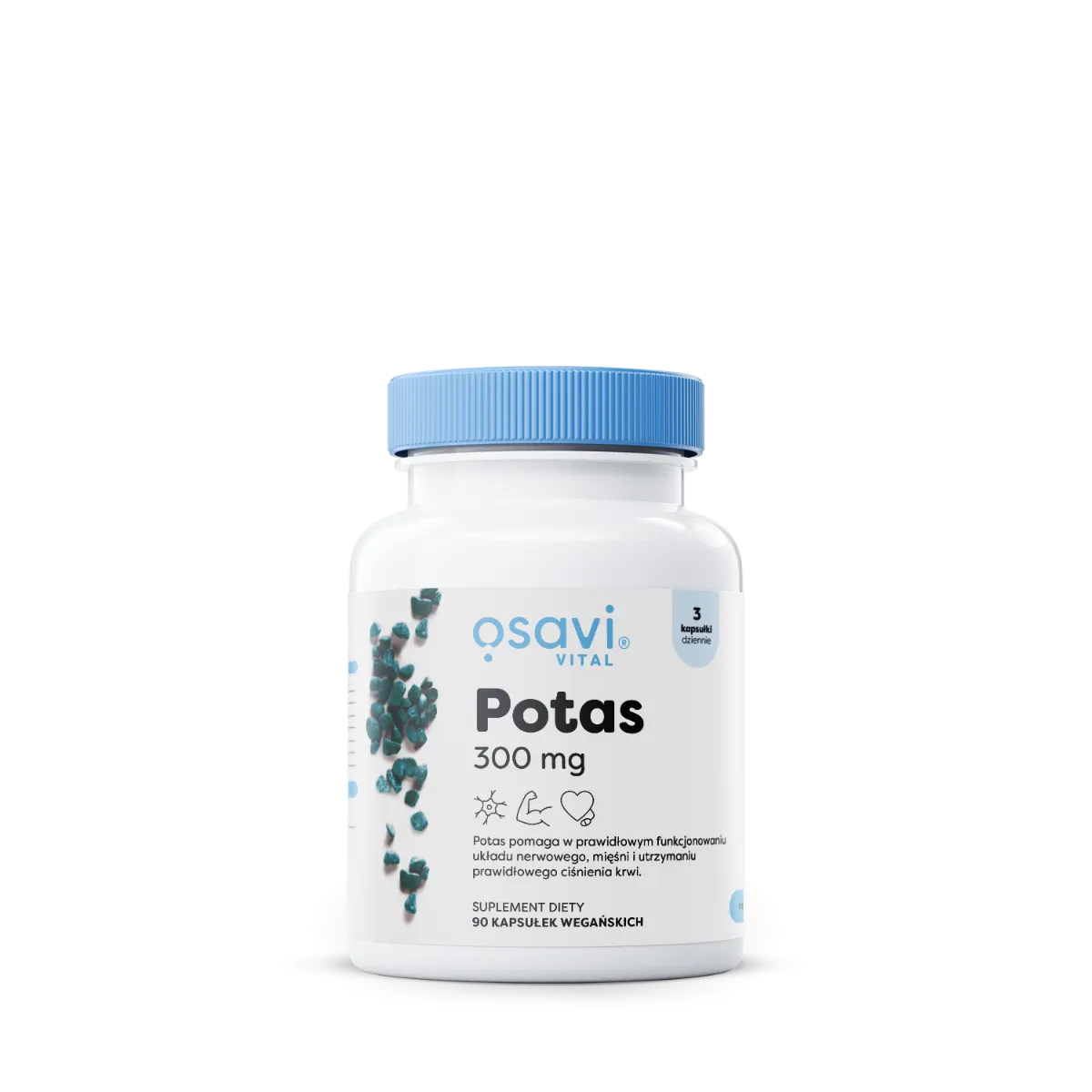 Suplement diety w postaci kapsułki twardej zawierającej potas w wysoko przyswajalnej organicznej formie – cytrynianu potasu. Odpowiedni poziom potasu jest niezbędny do prawidłowego funkcjonowania organizmu.
