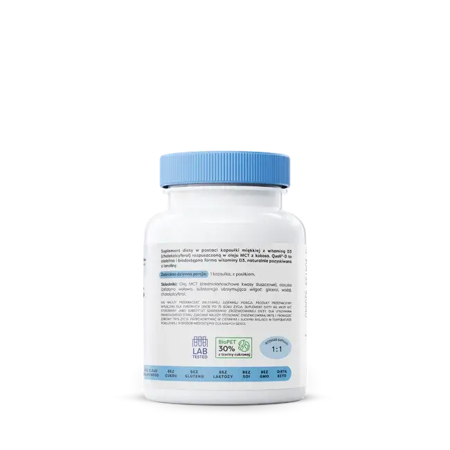 Suplement diety w postaci kapsułki miękkiej z witaminą D3 (cholekalcyferol) rozpuszczoną w oleju MCT z kokosa. Quali®-D to stabilna i biodostępna forma witaminy D3, naturalnie pozyskiwana z lanoliny.